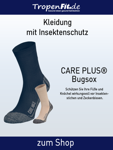 Um sich optimal vor Insektenstichen in Risikogebieten (Malaria, Zika-Virus, Gelbfieber, Dengue-Fieber) zu schützen, empfiehlt sich die Mitnahme eines hoch wirksamen Anti-Moskitomittels (Wirkstoff DEET). Die Kleidung sollte möglichst hell und lang sein (Hose, Hemd und Socken) und idealerweise aus stichfestem oder imprägniertem Stoff. Nachts sollten Sie unter einem imprägnierten Moskitonetz schlafen und in einfachen Unterkünften einen insektenabweisenden Innenschlafsack verwenden.